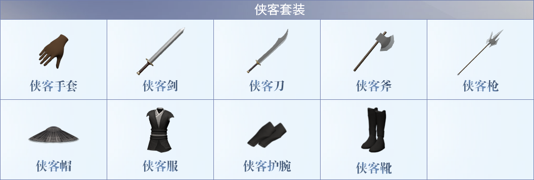 侠客套装:新手套装,穿戴后有少许属性加成。